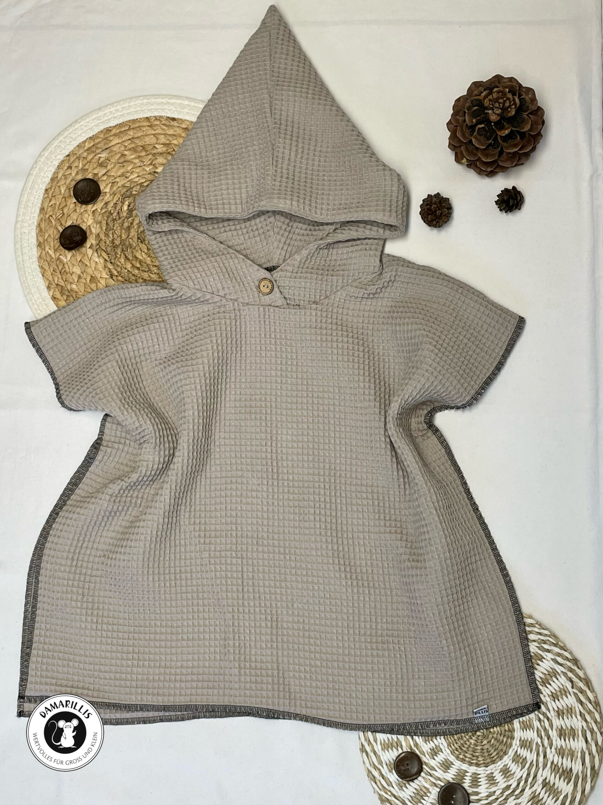 Das kuschelig-weiche Baumwollgewebe in der beliebten Waffeloptik trocknet rasch und spendet wohlige Wärme nach dem Bad. Das voluminöse Waffelstruktur-Doppelgewebe nimmt Feuchtigkeit wunderbar auf, ohne zu beschweren. Die praktische Ponchoform lädt geradezu zum Hineinschlüpfen ein. Die Kapuze läuft zu einem Spitz, was ihm einen niedlichen Zwergenlook verleiht. Der Holzknopf in der Mitte der Kapuze dient als Dekoration.
