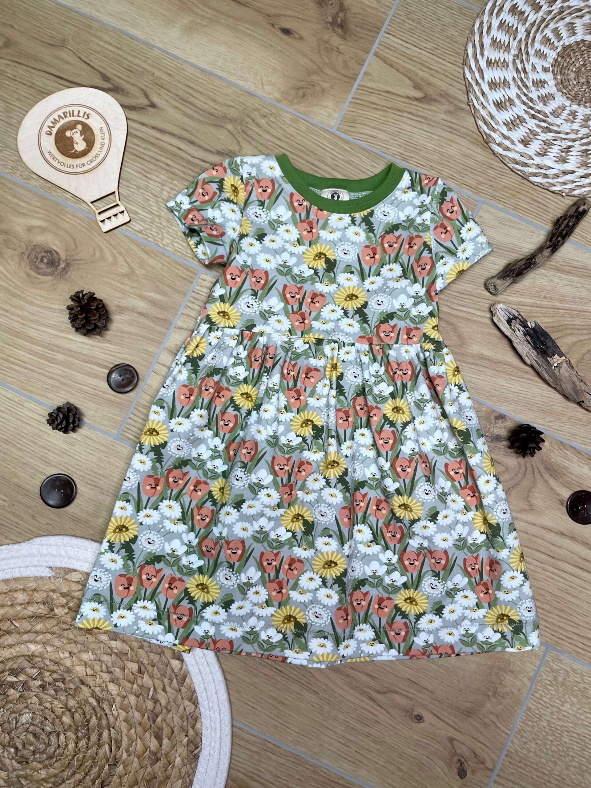 Ein zauberhaftes Kleid aus einem weichem Jersey. Mit diesem süssen Kleid mit den lachenden Blumen fällt deine Tochter im Sommer auf.