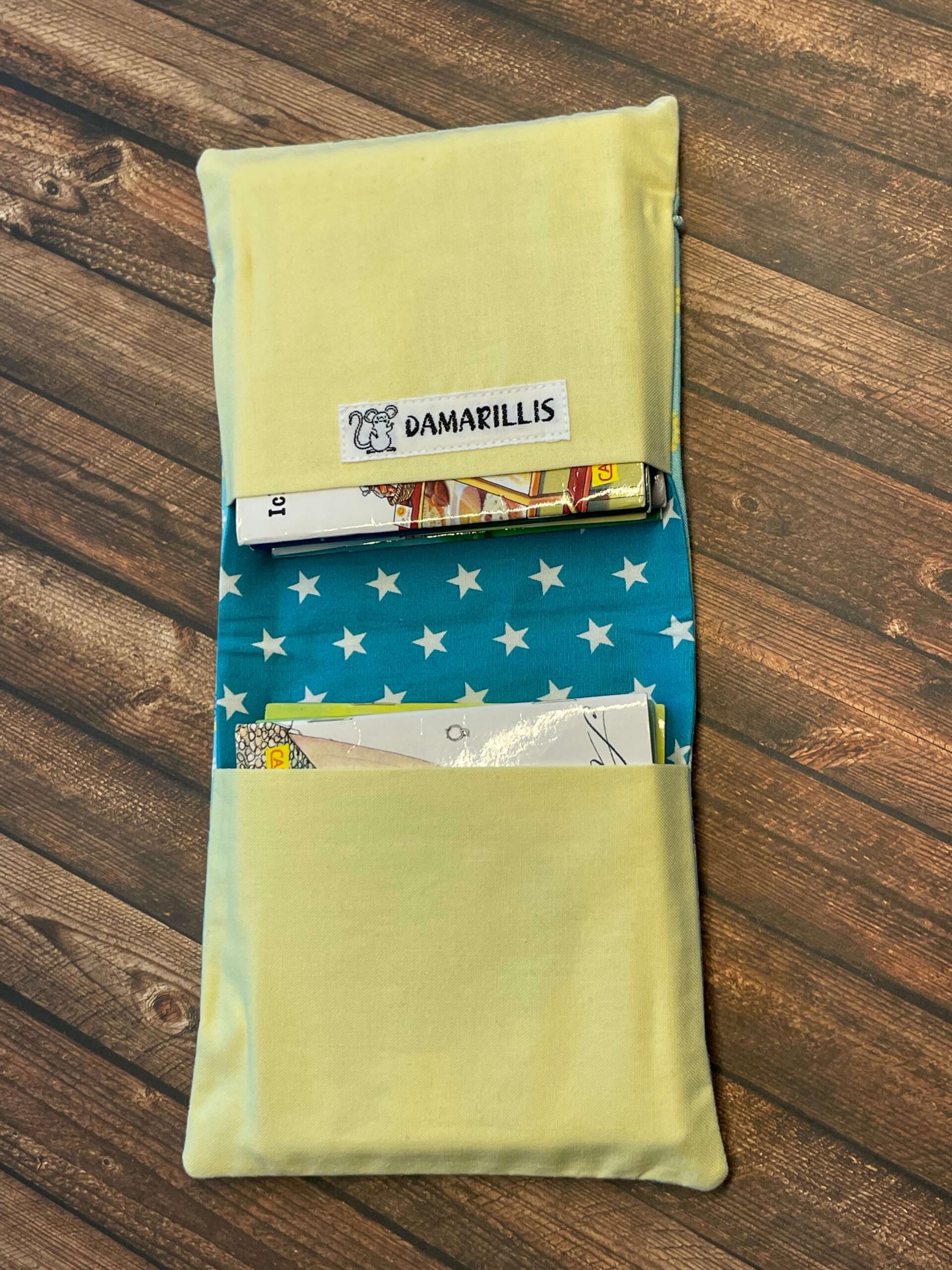 Ein tolles kleines Mitbringsel, praktisch für unterwegs oder auch, um zu Hause etwas mehr Ordnung in die vielen kleinen Büchlein zu bringen. Die Hülle ist aus reinem Baumwollstoff und mit einer leichten Vlieseinlage genäht (damit sie etwas fester wird).